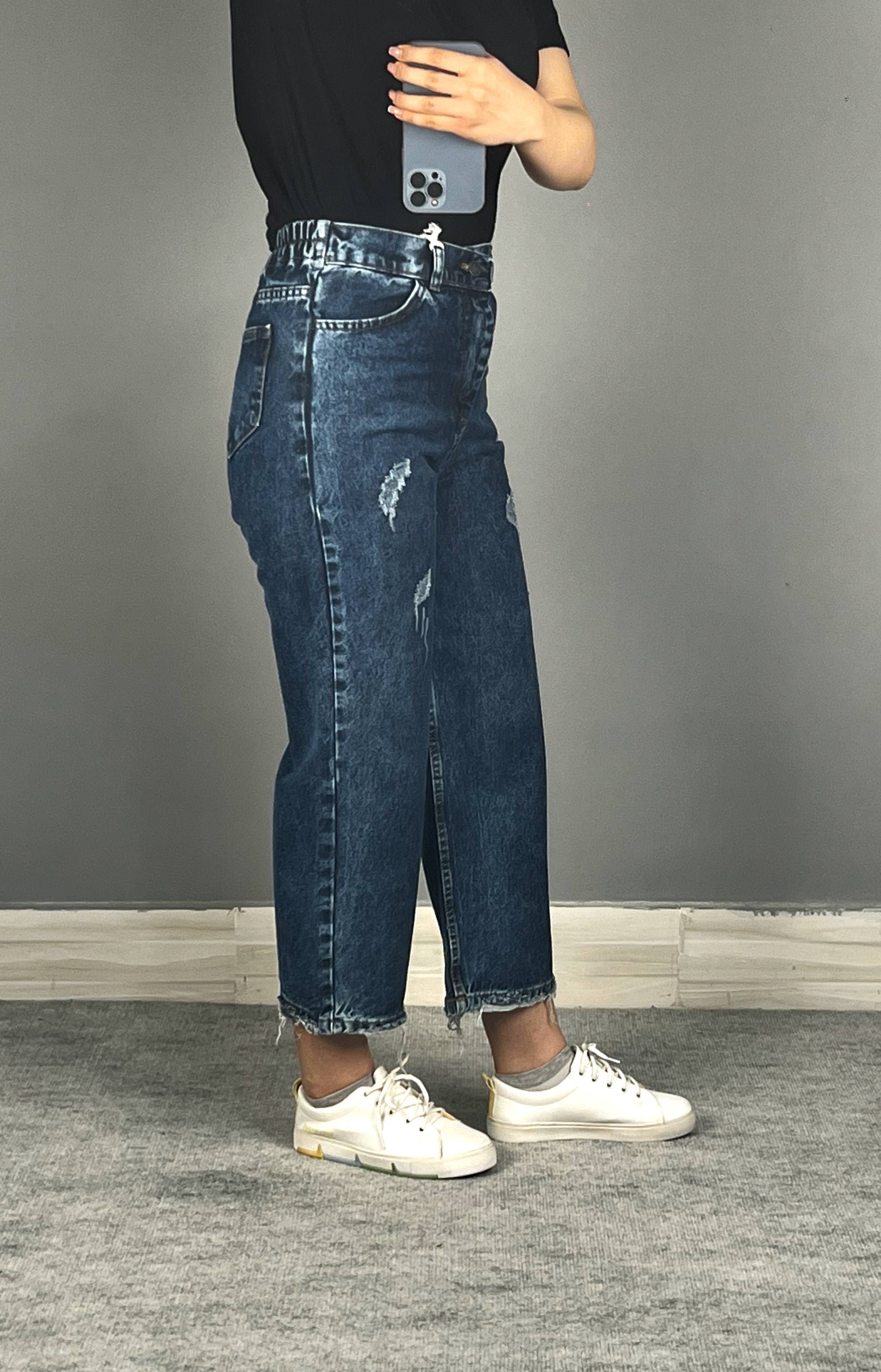 شلوار لی زنانه،جنس جین سنگشور،رنگ سورمه ایی،مدل واید لگ پایین ریش خراشدار،قد۹۰سانت